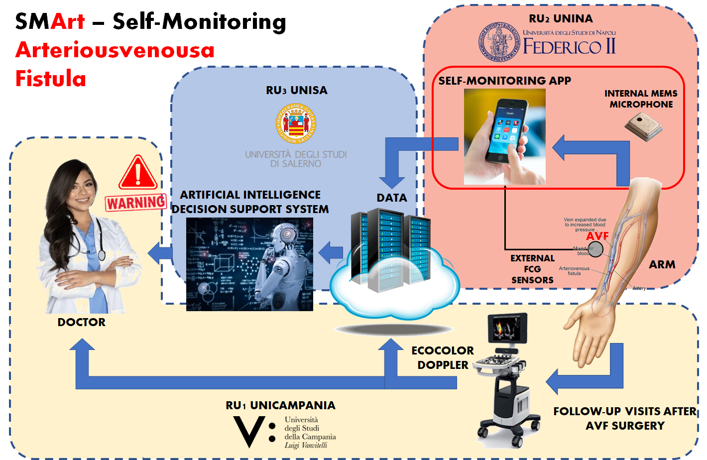 • Advanced signal processing and Artificial Intelligence Advanced processing and analysis of AVF data to support medical decision by providing high-level suggestions and early warnings about potential alterations of AVF health conditions (e.g., development of a stenosis at early stages), which will help clinicians to pay attention to latent pathological cases, and intervene more promptly to remedy or even prevent possible adverse events.