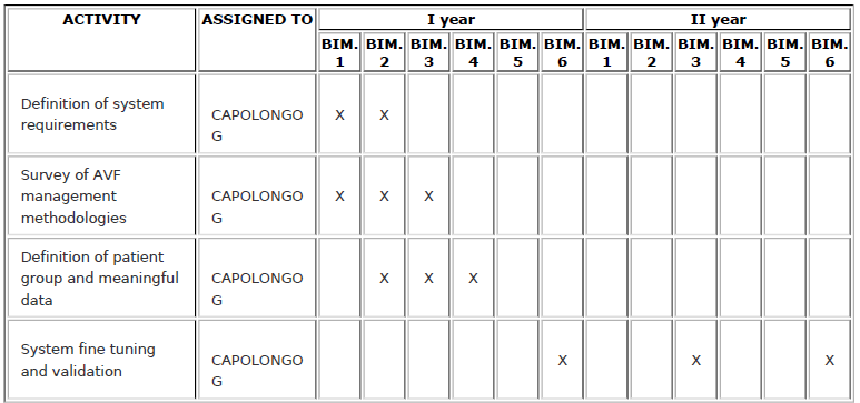 The objective of this WP is to design the whole home-care surveillance system. The UNICAMPANIA unit, which is the project leader and the medical unit, will be responsible for the accomplishment of this WP. This WP will provide detailed definition of the system requirements, in compliance with medical guidelines for AVF patients management and with organization of healthcare services.